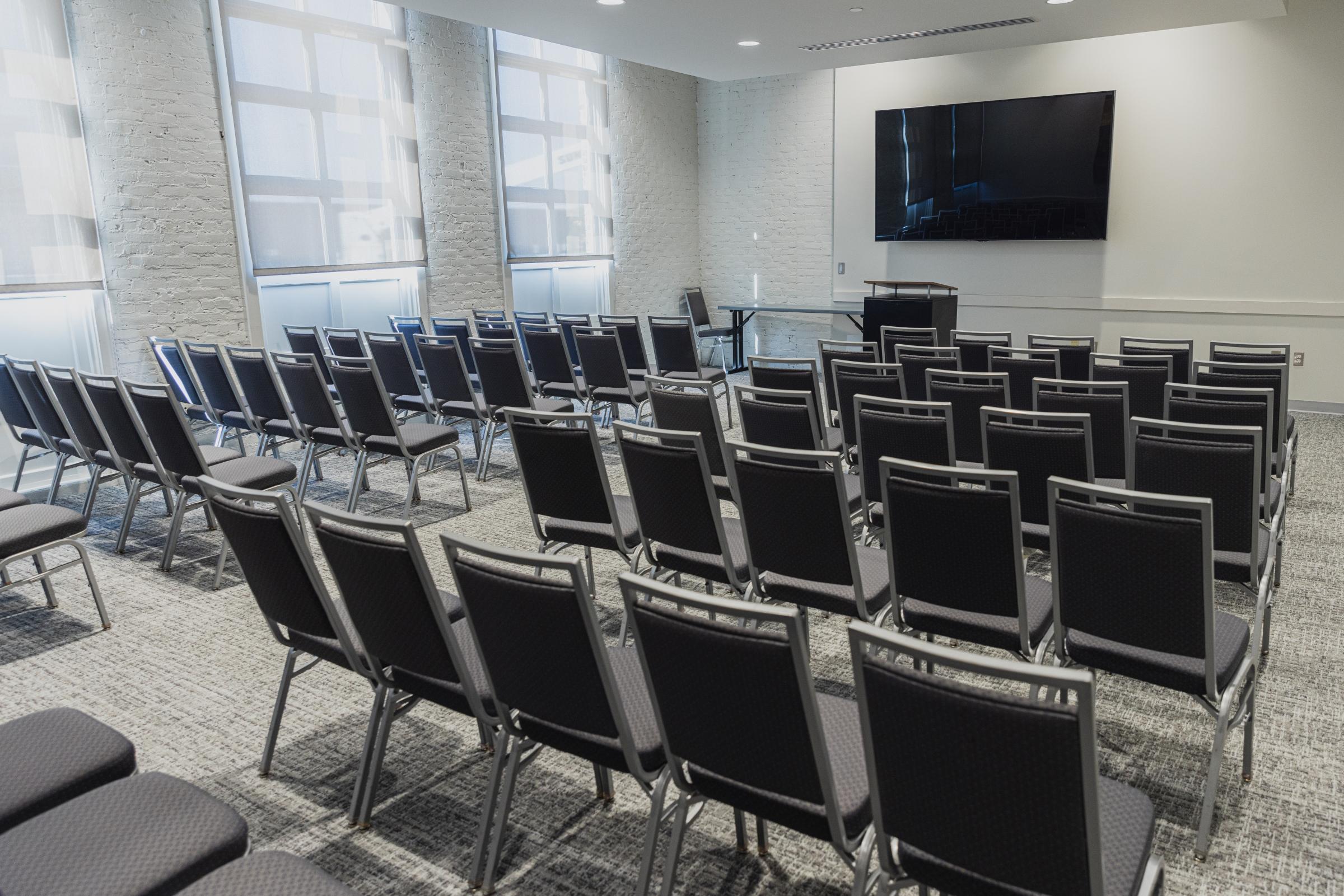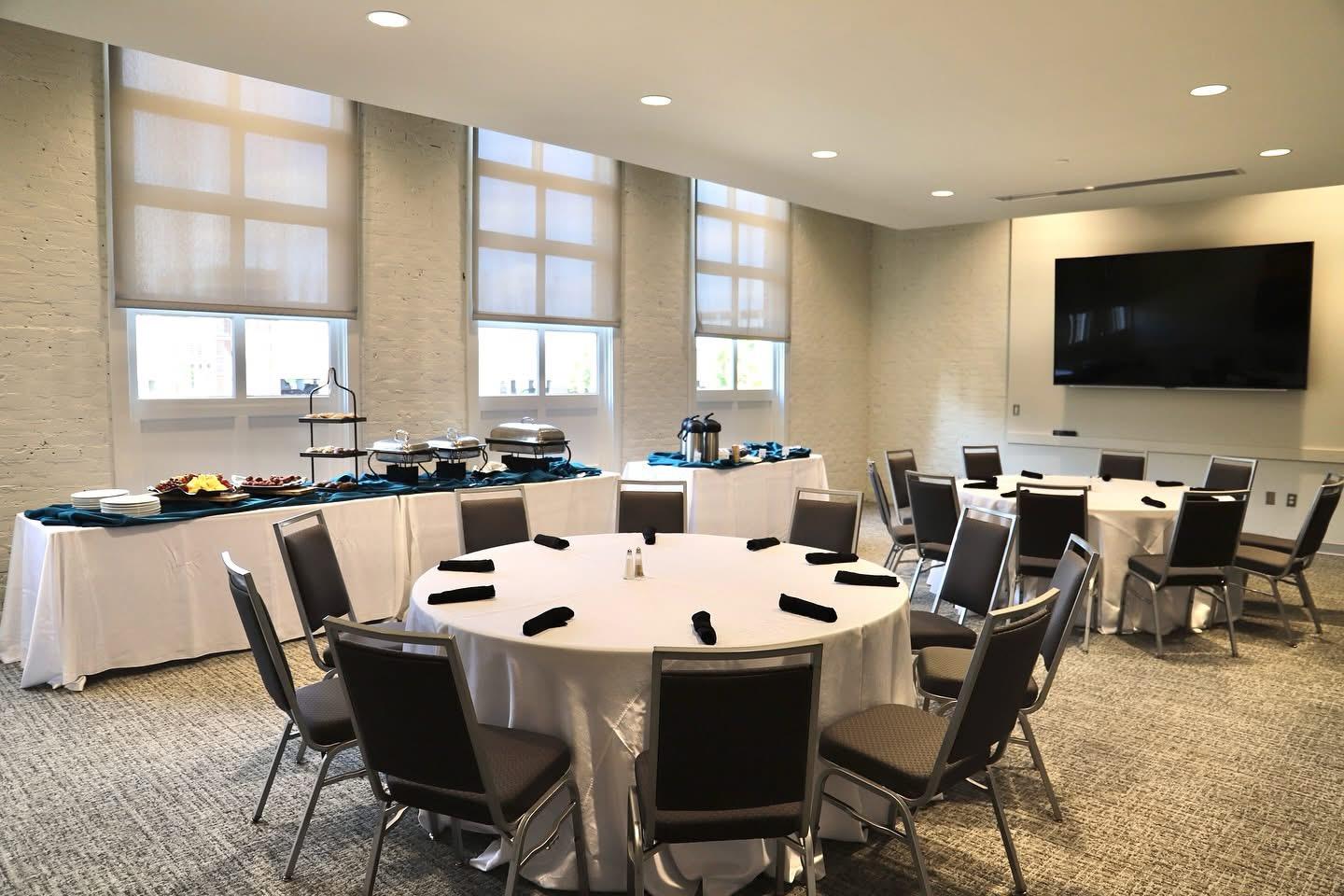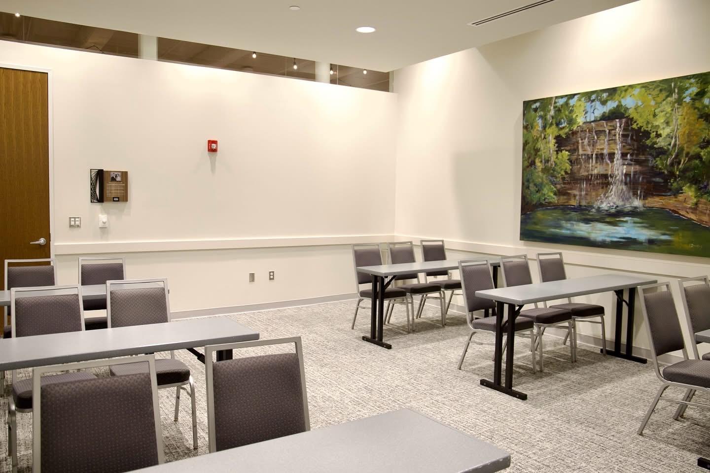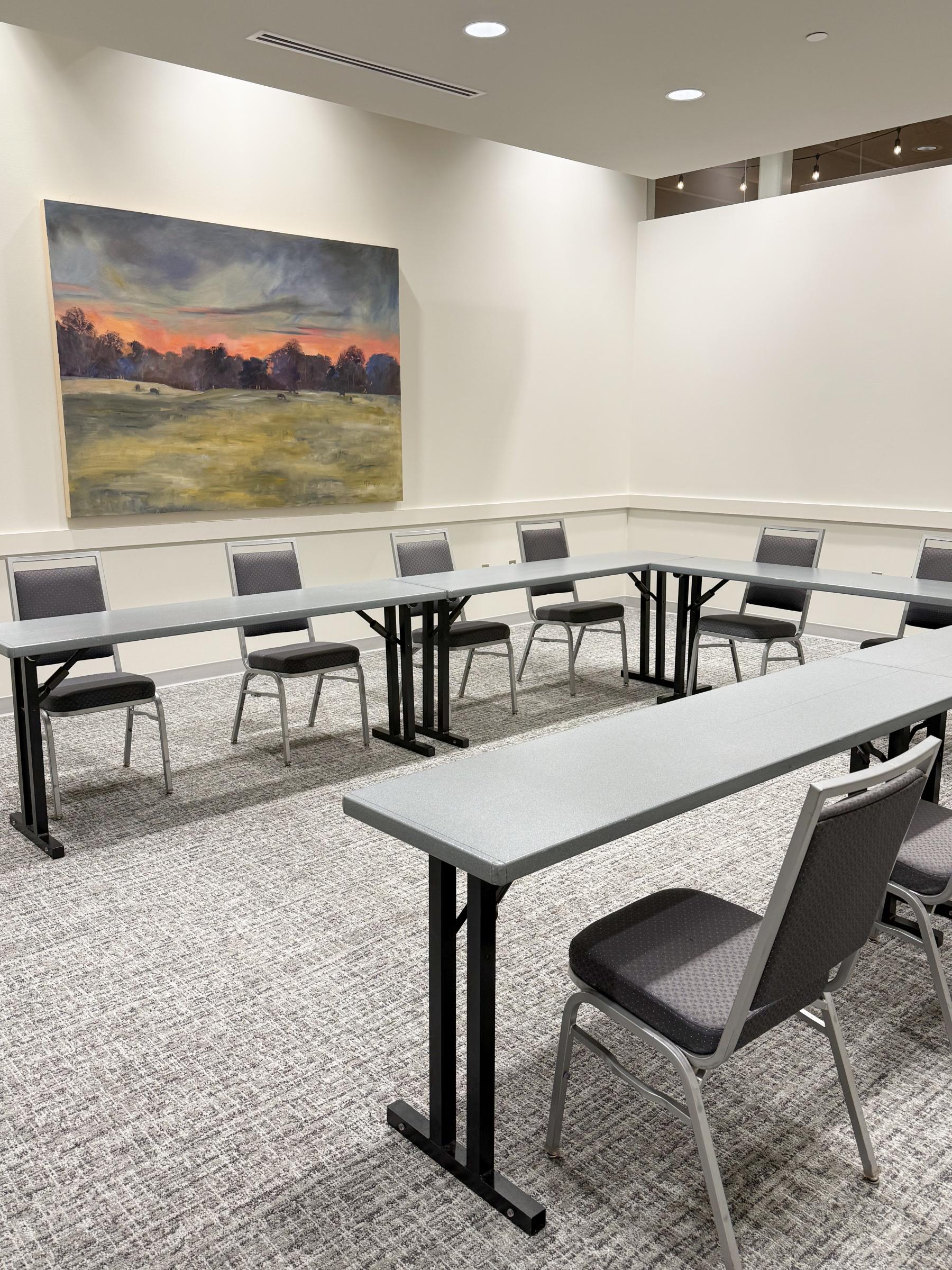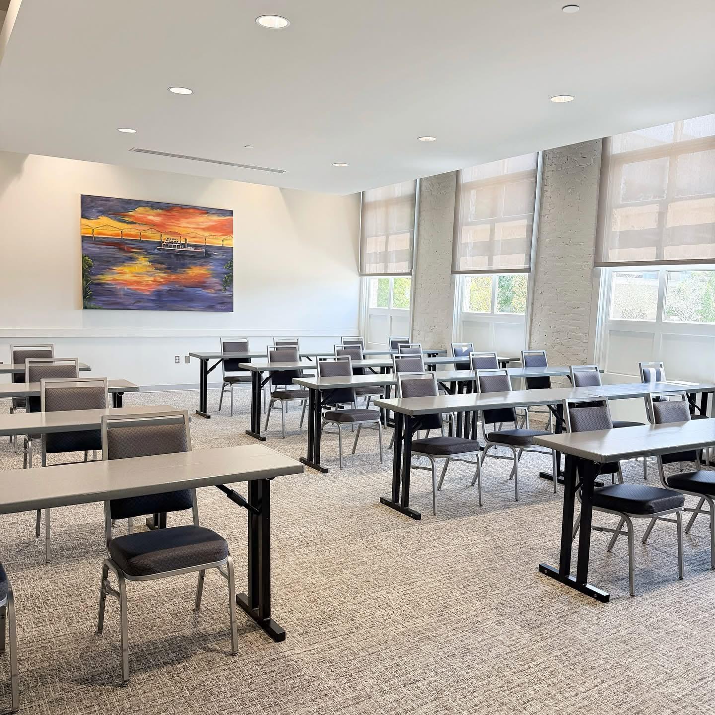 This bright and cheerful room can be set up with banquet seating, classroom, or theater seating. The room’s many windows feature shades that can easily be lowered to dim the room when necessary.